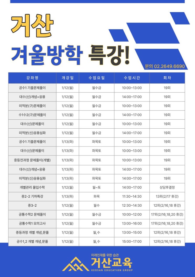 * 겨울방학 특강 스케줄변동으로 재공지 드립니다! 많은 학생들이 겨울방학 특강에 참여하여 학업에 도움이 되길 바라고 응원합니다~!! <img src="https://blogthumb.pstatic.net/MjAyNTEyMTZfMTgg/MDAxNzY1ODY2Njk0OTgy.tOefx38xFIuB1f1lLT-jwlevgdEqQ1lvN2dD6sRYl9Qg.TUtf5uSw-Jxa5wc-3gwgywcIj1di4adzGU7JYSiyQ14g.JPEG/%B0%DC%BF%EF%B9%E6%C7%D0%C6%AF%B0%AD%BC%F6%C1%A4%BA%BB.jpg?type=s3" />