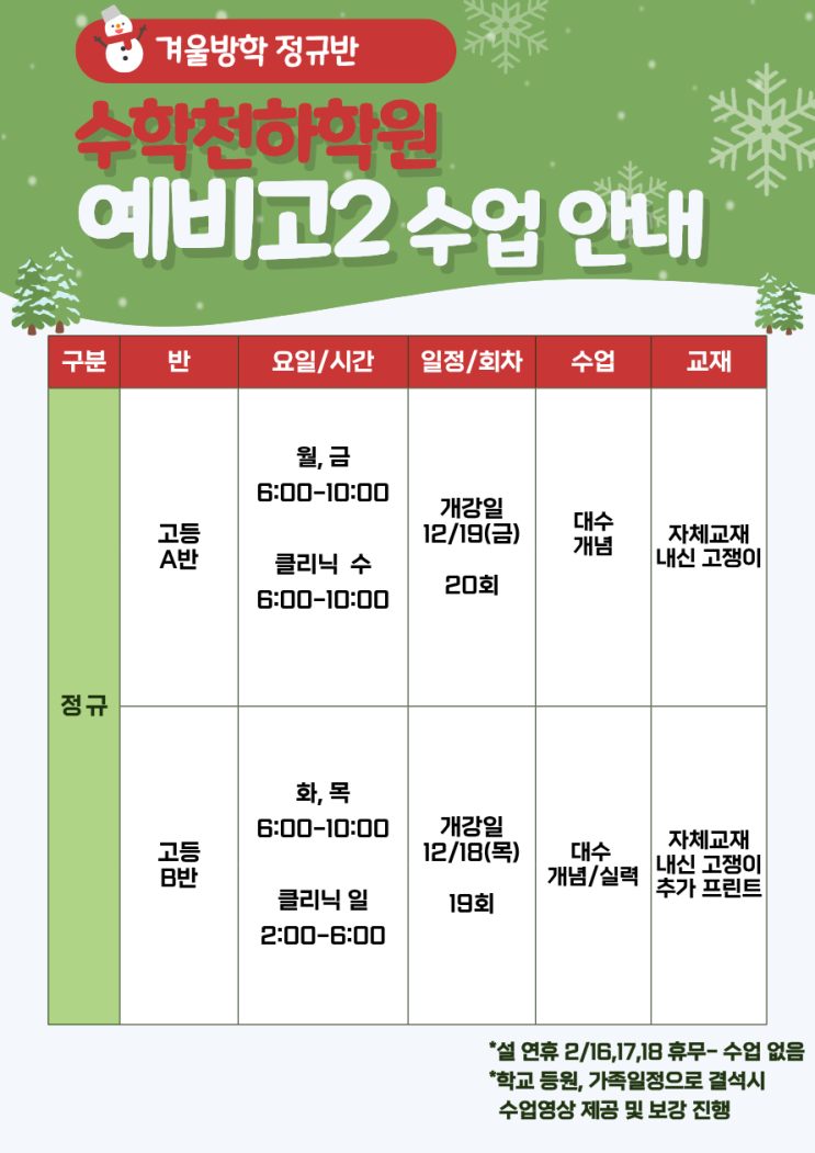 수학천하 2026년 겨울방학 정규반 안내 (예비고2)