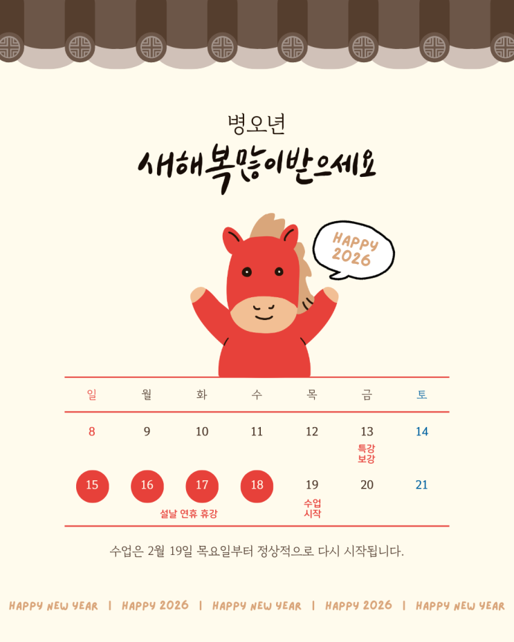 구정 연휴 휴강 안내 안녕하세요. Camper English입니다. 구정 연휴 휴강 안내드립니다. 휴강 기간 : 2월 16일(월) ~ 2월 18일(수) 정상 수업 시작 : 2월 19일(목) 2월 19일 특강반과 일반반 모두 정상 수업이 시작됩니다. ✔ 법정 공휴일 휴강은 별도의 보강 수업은 진행되지 않습니다. ✔ 연휴 기간 중에도 숙제는 기존 일정대로 진행됩니다. (아이들에게 별도 공지 했으며, 최대한 숙제를 해올수 있도록 해주세요!) 가족과 함께 따뜻하고 행복한 명절 보내시길 바랍니다. 연휴 이후 더욱 집중도 높은 수업으로 만나겠습니다. 새해 복 많이 받으세요. Beyond limits, beyond ordinary. 감사합니다. <img src="https://blogthumb.pstatic.net/MjAyNjAyMTNfMjU4/MDAxNzcwOTU2MDgwNzQy.HXW8lEk8TjxL2_faEZNuxwFargnQpd7NQHRCAHsLx24g.f_wypcjIBgfZkRxDInSRJgD42gk_co2VzMFQ3j1uUoUg.PNG/%BA%A3%C0%CC%C1%F6%BB%F6_%BB%A1%B0%A3%BB%F6_%BA%B4%BF%C0%B3%E2_%B8%BB_%BB%F5%C7%D8_%BF%AC%C8%DE_%B9%E8%BC%DB_%B4%DE%B7%C2__%C0%CE%BD%BA%C5%B8%B1%D7%B7%A5_%B0%D4%BD%C3%B9%B0.png?type=s3" />