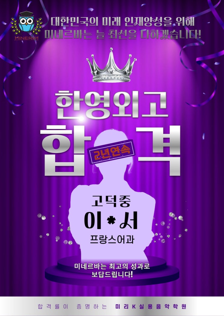 안녕하세요, 미네르바 학부모님들 오늘은 한영외고 최종 합격 발표가 있었던 날입니다 오후 3시, 1차 합격 이후, 기다리던 합격소식이 전해졌습니다! 미네르바 영어·수학에 중학교 1학년부터 재원해 온 고덕중 이*서 학생이 한영외국어고등학교 프랑스어과에 합격 하였습니다. 중등 기간 동안 내신만이 아니라 수능과 외고 입시까지 체계적으로 준비해 온 결과이며, 특히 2년 연속 한영외고 합격생 배출이라는 점에서 미네르바 중등부 교육 시스템의 경쟁력을 다시 한번 보여주는 성과입니다. 항상 응원해주신 학부모님들 감사드립니다~^^ 한영외고 합격생을 만든 미네르바의 중등부 시스템! 미네르바 중등부는 단순히 문법 위주의 내....... <img src="https://blogthumb.pstatic.net/MjAyNTEyMTlfMjI3/MDAxNzY2MTM0OTM0MjE2.11UDv25JAMwEN0_DBRFwDBXuQxe76G7i8oJ56eWftS0g.VrLUMHvT8YPxo5QcvdMH7QlroZKroL6_2i-hX3L4Vmsg.JPEG/%C0%CC%B9%CE%BC%AD_%C7%D5%B0%DD.jpg?type=s3" />