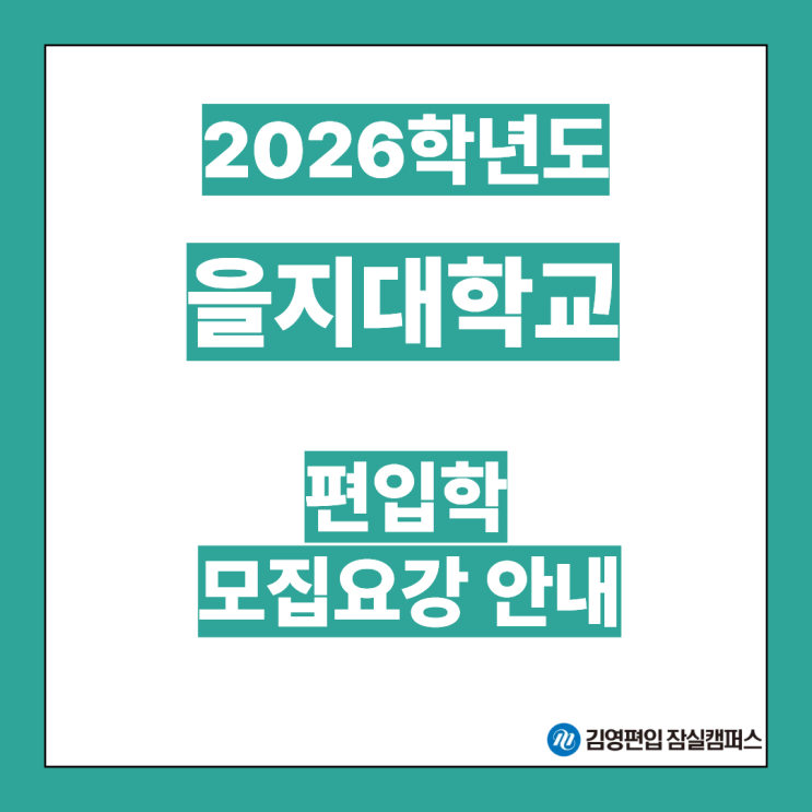 안녕하세요. 편입합격의 모든 것!! 강남 서초 송파 잠실 구리 남양주 중랑 광진 강동 천호 김영편입 잠실캠퍼스입니다. 을지대학교에서 2026학년도 편입모집요강을 발표했는데요. 자세한 내용을 살펴보겠습니다. 1. 전형별 모집인원 2026학년도 을지대학교 편입학 시험은 의과대학, 간호대학, 보건과학대학, 미래융합대학, 휴먼서비스학부 등 학과 및 학부별 모집인원 제시되었습니다. 재외국민과 외국인(비제한) 편입학은 표시된 모집단위만 모집하며, 모집정원에 대한 제한이 없습니다. 2. 원서접수 및 전형일정 2026학년도 을지대학교 편입학 시험의 원서접수 기간은 2025년 12월 22일(월)부터 12월 26일(금) 18시까지입니다. 서류 제출은 202....... <img src="https://blogthumb.pstatic.net/MjAyNTEyMTlfMjI5/MDAxNzY2MTEwODE2Mzg3.uJIHL74d-hkqxeOMv8RDB5xdNdb0zTInWJRfg6MnNosg.NZRmn_3bV4DX3YMWbYYpq8jm1pSk4fh3qN6ktckc0m0g.PNG/20251219_%C0%BB%C1%F6%B4%EB.png?type=s3" />