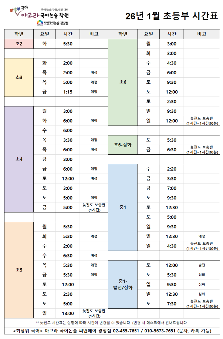 안녕하세요, 아고라 국어논술 씨앤에이 광장점입니다 ^^ 2026년 1월 시간표 안내 드립니다. 초등부 시간표 ** 늦진도 시간표는 상황에 따라 시간 변동이 있을 수 있습니다. 변경시 상담실에서 안내드리니 참고 부탁드립니다. ** 현재 마감인 반이 많으므로, 원하시는 시간대의 입학 가능 여부는 별도로 문의 부탁드립니다. ** 기타 궁금하신 사항은 전화, 문자, 카톡으로 문의 가능하십니다. 광장 <최상위국어> 아고라 국어논술 학원 <문의> 02-455-7651 02-456-7651 010-5673-7651(문자, 카톡 가능) ―――――――――――――――――――――― 올림픽대교 북단사거리 아차산로 475, 3층 #씨앤에이논술광장점 #광장동초등논술 #광....... <img src="https://blogthumb.pstatic.net/MjAyNjAxMDJfMTMy/MDAxNzY3MzUwMTgxODAw.0WzgUZ8S1wvC57S8gI_s3ZvtwDWpXESQoHPnIG7cF-Ag.SDG_GitM8wrjdl7AbsedWTKGIS7K4K5ByK_Szhb9dFQg.PNG/%C3%CA%B5%EE_%BD%C3%B0%A3%C7%A5.png?type=s3" />