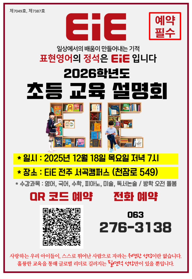 안녕하세요, 학부모님. EiE 전주 서곡캠퍼스 원장입니다. 어느덧 한 해가 마무리되어 가고, 2026학년도를 준비해야 할 시기가 찾아왔습니다. 우리 아이의 영어 교육 방향을 고민하셨던 학부모님들께 도움이 될만한 소식 하나 전해드립니다. EiE 전주 서곡캠퍼스에서는 2026학년도 초등 설명회를 진행합니다. 이번 설명회에서는 아이들의 학년별·레벨별 학습 로드맵 학원에서 이뤄지는 과목별 커리큘럼 우리 아이가 어떤 과정부터 시작하면 좋은지 등을 학부모님의 눈높이에 맞춰 자세히 안내해드릴 예정입니다. 특히, “우리 아이에게 지금 가장 필요한 영어는 무엇일까?” “초등·중등에서 어떤 학습 방향을 잡아야 할까?” 이런....... <img src="https://blogthumb.pstatic.net/MjAyNTExMTdfMTE3/MDAxNzYzMzc0NTcyMzI0.epqwNhRYO40oC0o-1ijAVYX0qAJ121FPZ9XvkR8X-pMg.er6Makx-cml87b2Tm0rMihqQln1nssv9y3mK5BJ7AUkg.PNG/2026%C7%D0%B3%E2%B5%B5_%C3%CA%B5%EE%B1%B3%C0%B0%BC%B3%B8%ED%C8%B8_%BE%C8%B3%BB%B9%AE.png?type=s3" />