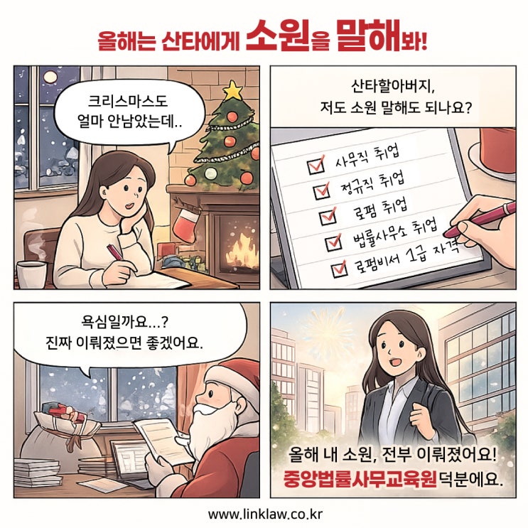 올해 소원 리스트, 전부 체크 완료! 사무직·정규직·로펌 취업까지 중앙법률사무교육원과 함께라면 꿈이 현실이 됩니다.✨ 내년엔 당신 차례예요 수강문의 02-525-1007 <img src="https://blogthumb.pstatic.net/MjAyNTEyMDVfMjMz/MDAxNzY0ODk5OTI5Mzc3.6QxPY-G-s98Ma985Xo6bx9gI3yJlkk9SJhptfwKNKEYg.PXQ0Cc1d6PRZ-rea5USLH5nVvfPPdJnhDk8aZPiSlykg.JPEG/4%C4%C6%B8%B8%C8%AD_251205.jpg?type=s3" />