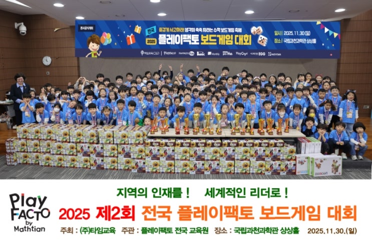 안녕하세요! 지난 11월 30일(일), 국립과천과학관 상상홀에서 열린 2025 제2회 전국 플레이팩토 보드게임 대회에 양현플레이팩토 친구들과 함께 다녀왔습니다. 대회 개요 이번 대회는 타임교육에서 주최하고 플레이팩토 전국 교육원이 주관한 전국 규모의 보드게임 축제였습니다. 전국에서 모인 수많은 어린이들이 함께 사고력을 겨루고 수학적 즐거움을 나누는 뜻깊은 자리였습니다. 부모님들과 함께 국민의례부터 하고 대회를 시작했어요. 우리 양현플레이팩토 친구들도 그동안 갈고닦은 실력을 마음껏 발휘하며 대회에 참가했습니다. 파란색 티셔츠를 입은 참가 학생들의 열정 넘치는 모습이 정말 인상적이었습니다. 우리 멋진 양현플레이팩토....... <img src="https://blogthumb.pstatic.net/MjAyNTEyMDZfOTcg/MDAxNzY1MDAxOTIyNzQz.fcBoCzJCl3HW9DEC0RHEJ0DIikuyCm3OMpagzra1678g._O8c4cNcQVVaqfHMhmAjshTwdPfWq950HE0BKkNmdzgg.JPEG/900%A3%DF1%BA%CE_%C2%FC%B0%A1%C0%DA.jpg?type=s3" />