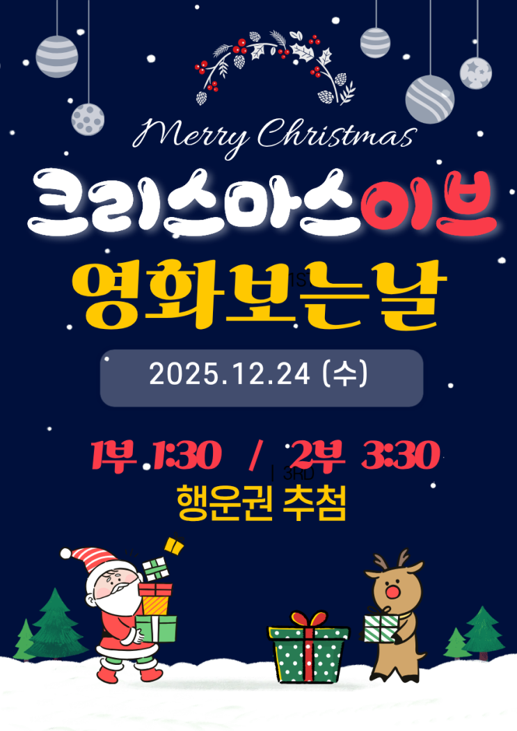 안녕하세요 심스영어학원입니다! 연말을 맞아 아이들이 즐겁게 웃고 추억을 만들 수 있는 크리스마스 친구초대 이벤트를 준비했어요 이번 이벤트는 딱 7명만 참여 가능한 소규모 이벤트로 친구와 함께 부담 없이 즐길 수 있는 시간으로 구성했습니다. 이벤트 참여 방법 ✔ 원장님께 초대장을 받은 친구라면 참여 가능! 참여 혜택 ✔ 참여한 친구 모두 크리스마스 선물 증정 ⏰ 진행 시간 안내 1부 : 오후 1시 30분 2부 : 오후 3시 30분 아이들 집중도와 참여도를 고려해 시간대별로 나누어 진행합니다 이벤트 주요 구성 ✔ 크리스마스 분위기의 영화 관람 ✔ 설레는 행운권 추첨 이벤트 ✔ 연말 분....... <img src="https://blogthumb.pstatic.net/MjAyNTEyMTlfMjI4/MDAxNzY2MTM0MjY2Mjc1.pjb0CjfYAda6Hj66YfOoPD1ynieoS2-Qqg6t1eYn8SMg.h1KeNOjYxDLpJG59G5UQQVpy1nV3xCTfxmERG8f3gs4g.PNG/image.png?type=s3" />
