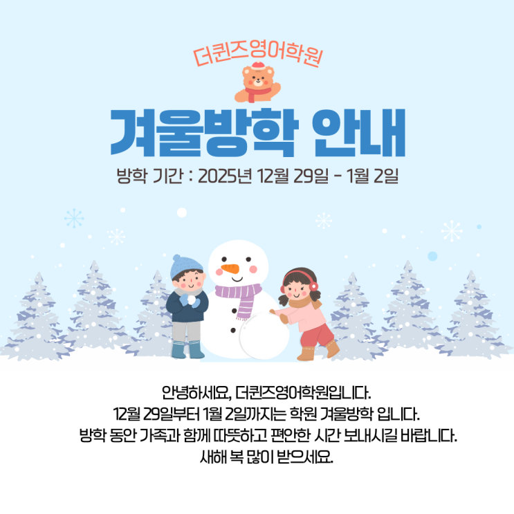❄️ 겨울방학 안내 ❄️ 안녕하세요, 더퀸즈영어학원 입니다 겨울방학 기간 2025년 12월 29일(월) ~ 2026년 1월 2일(금) 방학 동안에는 아이들이 가족과 함께 따뜻하고 편안한 시간을 보내며 재충전할 수 있기를 바랍니다. 새해에도 아이들의 꾸준한 성장과 배움을 위해 더 알차게 준비하겠습니다. 모두 건강하고 행복한 연말 보내시고, 새해 복 많이 받으세요!!! 감사합니다. 더퀸즈영어학원 드림 <img src="https://blogthumb.pstatic.net/MjAyNTEyMjFfMjM2/MDAxNzY2MzE2ODExMDkw.eBNalU7KIrRjti6ahe_cvf0JTaB3o6TFcg0oZSqPwxsg.mGPMNmiwn0q88JnfTIM9RSuCpUdoMZmnhunmgixsnpAg.PNG/2.png?type=s3" />