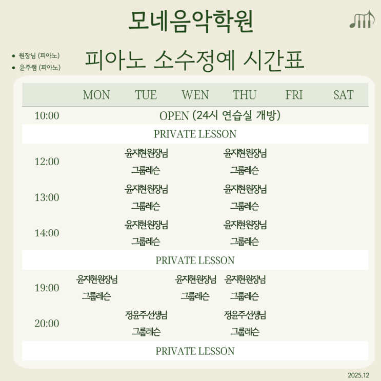안녕하세요 울산성인음악학원 모네음악학원입니다. 25년 12월 소수정예 시간표입니다. 소수정예 수업은 한 타임 최대 5명으로 운영됩니다. ✔ 수업 구성 (1회 50분 / 주 2회) 1:1 개인 레슨 10–15분 이론 설명 15분 (선택적 참여) 개인 연습 시간 각 수강생은 1:1 레슨을 받고, 남은 시간에는 배운 내용을 바로 정리하고 연습할 수 있습니다. ✔ 수업 예약 및 변경은 어플을 통해 간편하게 진행하실 수 있습니다. <img src="https://blogthumb.pstatic.net/MjAyNTEyMjZfMTQ1/MDAxNzY2NzIyNjIyNzcx.2ojw1Oj3HkUIvkA4Ar5qa937XzP2GLDh1RtpCFsSeAEg.hXV-cZDVETFGebJA3Eox8s6_Ow1n935kNJ4ONGySENsg.PNG/26.1_%BD%C3%B0%A3%C7%A5.png?type=s3" />