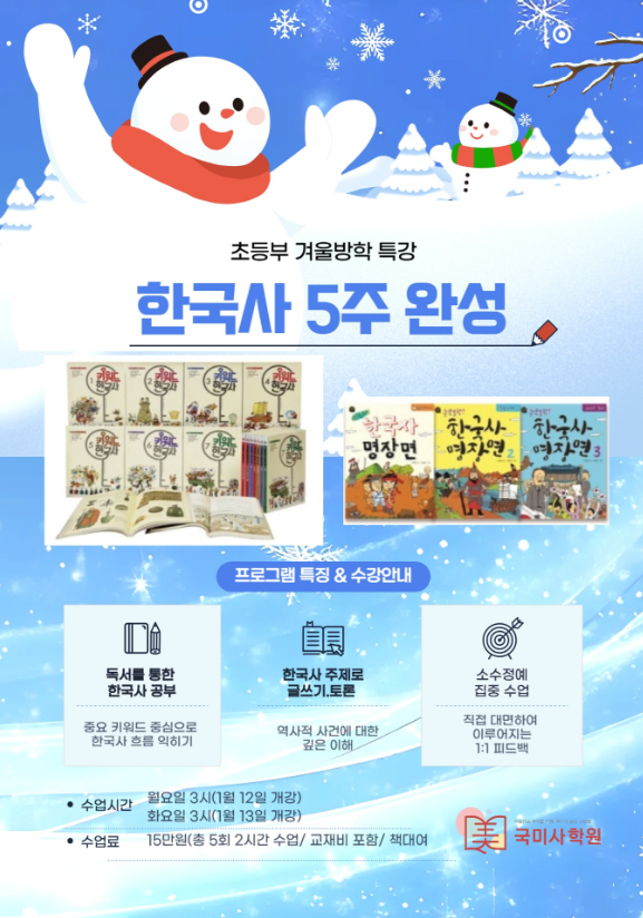 [특강 1] (초등) 한국사 마스터 - 일정 : 12/22~2/27 / 총 28회기 - 요일 및 시간 : (A반) 매주 월,수,금 오전 10시 ~11시 30분(90분) / 28회기 : (B반) 매주 화.목 오전 10시~12시(120분) / 17회기 - 대상 : 초등 4~6학년 (* 반별 최대 6~8명, *선착순 마감) - 11월 말까지 사전등록수강생에 한해 첫 달 수업업료 20%할인. - 혼자 책 읽기, 한국사 흐름, 글쓰기 어려워하는 학생 필수!!