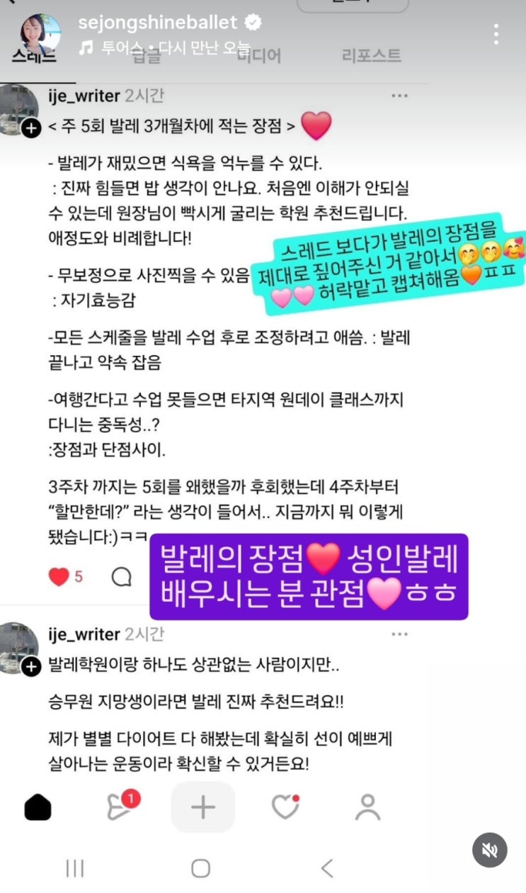 성인발레 배우시는 분들의 실제 장점과 매력을 와닿게 써주셨다ㅎ 인스타하다가 허락맡고 스레드에서 퍼옴 발레홀릭성인발레힐링발레❤️세종샤인발레/하안동발레학원