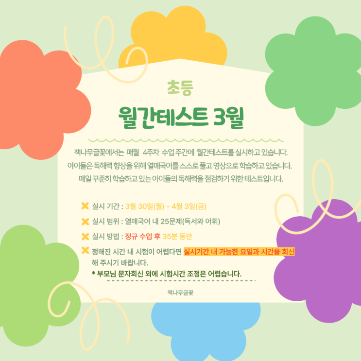 안녕하세요, 책나무글꽃 여러분~ 문자로 보내드린 수업안내에 있는 내용처럼 수업 4주차에 월간 테스트를 봅니다! 열매국어는 독해력의 거인을 만들기 위해 진행하는 책나무글꽃의 시그니처예요. 열매국어를 통해 발전하는 아이들의 독해력을 점검하기 위해 매월 테스트를 실시하고 있습니다. * 실시 기간 : 3월 30일(월) - 4월 3일(금) * 실시 범위 : 열매국어 내외 25문제 (어휘, 독서) * 실시 방법 : 정규 수업 후 35분 동안 진행 타 스케줄로 당일 내 진행이 어렵다면 실시기간 내 가능한 요일과 시간 회신 부탁드려요~ 부모님께서 미리 회신 주시지 않고 학생이 자체적으로 즉흥해서 시험을 안 볼 수는 없습니다. 바꾼 테스트 날짜를 어기면....... <img src="https://blogthumb.pstatic.net/MjAyNjAzMjBfNjkg/MDAxNzczOTgwMjM5MTI0.QxY7Ds4LtqOYc1GnvQfIkEb0eK7HSAQrC3dQ5bCx5qcg.UlsIWs2XsKPtpBGIpll7UU0fgqdTjvlYWrWzh0evgWMg.PNG/%C3%CA%B5%EE_%BF%F9%B0%A3%C5%D7%BD%BA%C6%AE_3%BF%F9.png?type=s3" />