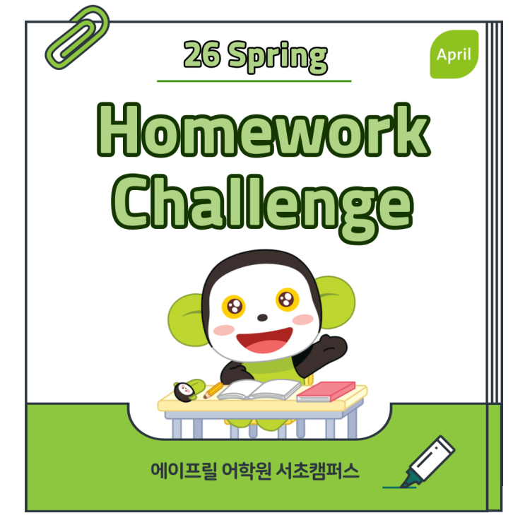 안녕하세요, 서초 에이프릴입니다. 아이들의 꾸준한 숙제 습관 형성을 위해 4월 한달 간 숙제 챌린지를 진행합니다! 이번 챌린지는 3월 30일(월)부터 4월 17일(금)까지, 총 3주간 진행됩니다. 이번 챌린지의 핵심은 “반 전체 전원 성공”입니다. 한두 명만 잘하는 것이 아니라, 우리 반 친구들 모두가 함께 참여하고 끝까지 해내는 것이 목표입니다. ✅ 챌린지 성공 조건 3주 동안 반 전체 전원이 하루도 빠짐없이 숙제를 해와야 하며 대충 해온 숙제는 인정되지 않습니다. 선생님들이 매일 꼼꼼히 확인할 예정이며, 숙제 완성도가 B 이상이어야 통과입니다. 즉, 빠짐없이 + 성실하게 + 기준 이상으로 해와야 성공할 수 있습니다. 이번 챌....... <img src="https://blogthumb.pstatic.net/MjAyNjAzMjZfMTAx/MDAxNzc0NTAwNTYzMzgx.4sWHEe7fBJx8VdbZztTHZuIqfJMPUllVgNbLccOd390g.233Mxz_sIMrNhLrxAGvnm4iVp9H7rE-fupuRDWWsCbYg.PNG/Monthly-Cover-024.png?type=s3" />