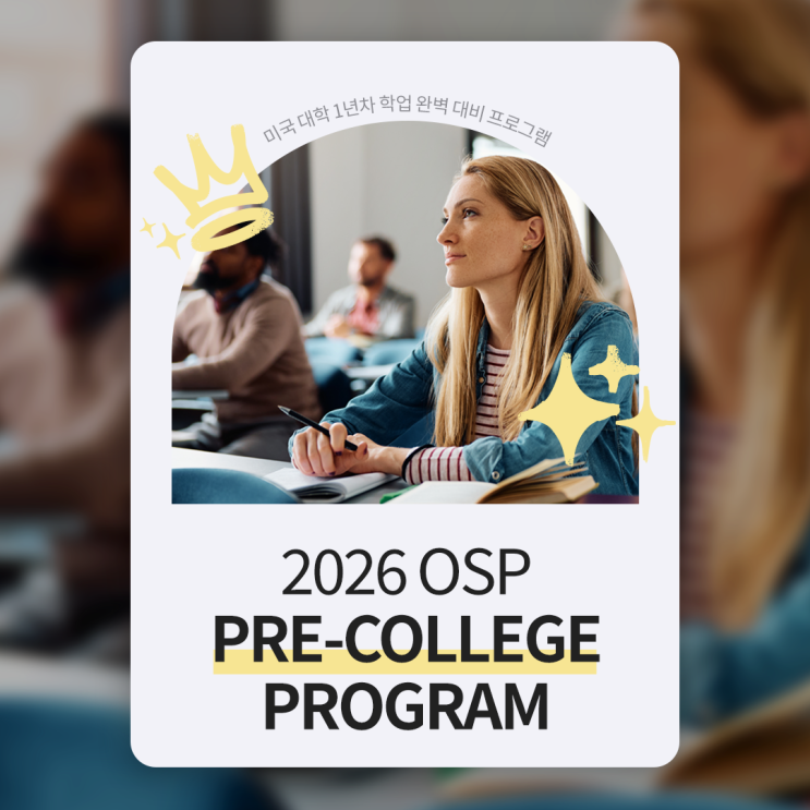 입학 전부터 큰 차이를 만드는 미국 대학 1년차 학업 완벽 대비 프로그램 2026 OSP PRE-COLLEGE PROGRAM이 오는 3-5월 진행합니다. 성공적인 미국 대학 생활을 원하시나요? 낯선 환경과 문화, 토론 중심 수업, 이전보다 훨씬 방대한 Reading · Writing까지 미국 대학 1년차에 요구되는 학습량과 수업 방식을 미리 경험하며 입학 직후 발생하는 학업 격차를 최소화하도록 설계된 맞춤 Pre-College 과정으로 완벽한 대학 생활의 출발을 준비하세요. OSP PRE-COLLEGE PROGRAM 일정 2026년 3~5월 장소 원스탑프렙 압구정 센터 대상 미국 대학 진학 예정자 * 원내·화상수업 가능 * 팀·개인 수업 가능 COLLEGE READING (Literary Analysis) 다양한 분야....... <img src="https://blogthumb.pstatic.net/MjAyNjAyMDlfMzMg/MDAxNzcwNjA5OTA4OTg0.XCh1a2afXSh8fnf_b1g2OJbcnGLIKRQImU8uOZzfFc4g.I3yZZpxOKoCpzuK2kZ0vR1yGzxMXQ_mrARXlT7uC_eEg.PNG/OSP_2026PreCollege_bg_26-02-09.png?type=s3" />