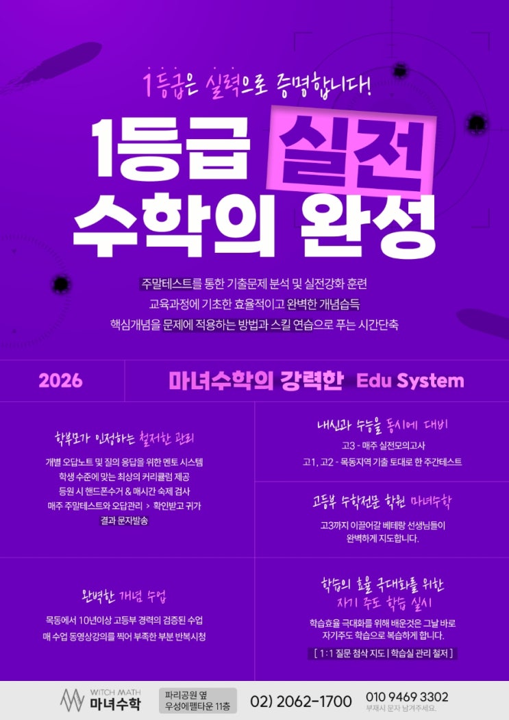 마녀수학 고등부 1학기 실전 대비 프로그램 안내 – 성적은 전략입니다. 준비된 실력이 결과를 만듭니다. 안녕하세요. 마녀수학 고등부 원장입니다. 고등부 수학은 단순한 문제풀이가 아니라 전략과 관리의 영역입니다. 내신과 수능을 동시에 준비해야 하는 고등 과정에서는 학생 수준별 세분화와 체계적인 관리가 성적을 좌우합니다. 마녀수학 고등부는 ✔ 등급대별 분반 ✔ 학교 내신 완벽 대비 ✔ 모의고사 실전 훈련 시스템 ✔ 매주 실전 기출문제관리 를 중심으로 1학기 프로그램을 운영합니다. 고1 정규반 Program ▪ 공통수학 1 내신 완성 & 심화 과정 고1은 고등수학의 방향이 결정되는 시기입니다. 개념 누적과 유기적이고 복합적인....... <img src="https://blogthumb.pstatic.net/MjAyNjAyMTJfMTQw/MDAxNzcwODg4NjM5NzY2.bfRYuTkXcxtuwLQPVaUh-Nq10FiBKp7ZMkt7hwrzCLog.MtQDk4rDGc84FxxsSn1r6Hqswcu7f7FGKWbsx5jIEx8g.JPEG/900%A3%DF1770888633180.jpg?type=s3" />