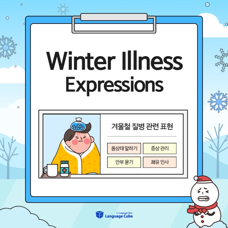 안녕하세요! 랭귀지큐브 종로센터입니다. 겨울에는 날씨가 추워지면서 몸의 변화를 직접적으로 체감하게 되는데요, 일상 대화에서도 겨울철 질병과 관련된 표현을 자연스럽게 주고 받게 됩니다. 오늘은 겨울철에 자주 겪는 증상과 상황을 중심으로 실제 회화에서 바로 사용할 수 있는 영어표현들을 정리했습니다. 서울시 종로구 삼봉로 57 호수빌딩 6층 02.734.1593 languagecube-jongro@naver.com <img src="https://blogthumb.pstatic.net/MjAyNjAxMjZfMjU0/MDAxNzY5Mzc2ODIxNzk0.N1N0zTrFnucWPQI9SX8ERqBqge14pu9LARvf9XpgqDkg.U-dG9keurXH8G2l4wbGxbwuoRU2drAyBUELinJ8LjcAg.JPEG/%B0%DC%BF%EF%C3%B6_%C1%FA%BA%B4_%B0%FC%B7%C3_%BF%B5%BE%EE_%C7%A5%C7%F6_1.jpg?type=s3" />