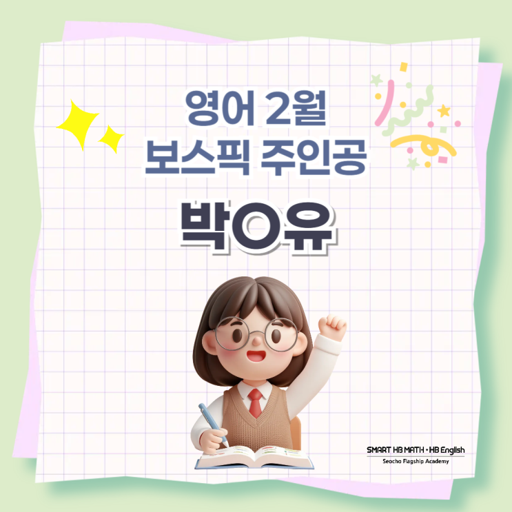 안녕하세요. 우리 아이를 위한 스마트한 선택! 스마트해법 서초플래그십점입니다. 오늘은 2월의 보스픽 ‘박O유’ 학생을 마지막으로 소개합니다. O유는 현재Intermediate 단계에 있는 학생으로 올해 중학생이 되었습니다. 중학생 시기부터 꾸준한 어휘, 문법, 독해 공부를 통해 탄탄한 영어실력을 쌓는 것이 중요한데요. O유는 방학동안 단어암기와 문법 공부 등 열심히 기본기를 다졌습니다. 영어를 얼마나 준비해 놓았는지는에 따라 대입에서의 경쟁력으로 이어지기 때문에 일찍부터 영어에 대한 기초실력을 쌓아놓는 것이 공부와 입시를 준비하는 데에 있어서 중요한 부분이라고 생각합니다. 보스픽 선정 이유 1) 성실한 과제 수행 O유는 방....... <img src="https://blogthumb.pstatic.net/MjAyNjAzMjZfMjY4/MDAxNzc0NDgwNDk1MTg5.LolUiJNTjSYOZP5af4NjfdXyp-INYAk-KoffPuDQt50g.xDhQ7_UENvQKo5w2iF5wF7hvEi7h8fb7krWpJcVhLNIg.PNG/%BC%AD%C3%CA%B5%BF_%BC%AD%C0%CC%C3%CA_%BF%B5%BE%EE%C7%D0%BF%F8-001.png?type=s3" />