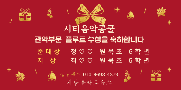 안녕하세요 예담쌤입니다♡ 시티 음악 콩쿨 <관악부분 >에서 기쁜 수상 소식을 전합니다 이번 콩쿨에서 우리 학생들이 준대상(대상 없는) & 차상이라는 값진 성과를 거두었습니다. 그동안의 노력과 시간이 만들어 낸 결과라 더욱 의미 있고, 진심으로 축하의 마음을 전합니다. 기초부터 차근차근 함께 시작했던 아이들이 이렇게 아름다운 열매를 맺는 모습을 보며 지도하는 저 역시, 너무나 뿌듯하고 감사한 마음이 가득합니다. 앞으로가 더 기대되는 친구들이에요. 처음 서 보는 무대였음에도 불구하고 긴장 속에서도 당당하게 자신의 연주를 끝까지 해내는 모습, 정말 너무너무 예쁘고 아름다웠습니다. 순간의 집중력과 용....... <img src="https://blogthumb.pstatic.net/MjAyNTEyMTRfMjky/MDAxNzY1NzIwNTAwNTEw.UI9Feq_lbaxMtULDJPhrOq3l6zO32N1NLbMPC0bS2vMg.3ZGGD4bRkLrSd9nlcXTq8bSQysCvPn52jq-vpJV_65Ag.PNG/900%A3%DF%BB%A1%B0%A3%BB%F6_%B9%D7_%B1%DD%BB%F6_%B0%ED%B1%DE%BD%BA%B7%B4%B0%ED_%BF%EC%BE%C6%C7%D1_%B0%B3%C0%CE%C0%FB%C0%CE_%C5%A9%B8%AE%BD%BA%B8%B6%BD%BA_%B9%E8%B3%CA%A3%DF20251207%A3%DF122753%A3%DF0000.png?type=s3" />