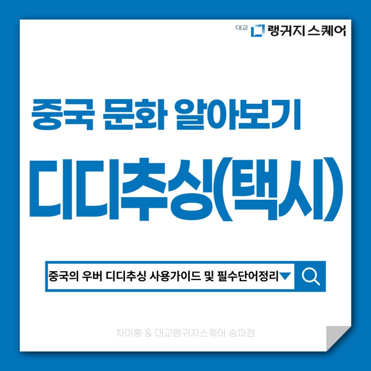 ✨ 중국 여행, 택시 걱정 없이 떠나기 안녕하세요! 차이홍 & 대교랭귀지스퀘어 송파점입니다. 중국 여행을 준비할 때 가장 고민되는 것 중 하나가 낯선 교통 시스템과 언어인데요. 길거리에서 택시 잡기, 가격 흥정하기, 목적지 말하기 등등 한국과 다른 시스템 때문에 처음엔 당황스러우실 거예요! 하지만 디디추싱(滴滴出行, Didi Chuxing) 앱을 사용하면 카카오 택시처럼 쉽고 편리하게 차량을 호출하고 이용할 수 있습니다. 중국어 초보자도 앱 설치와 간단한 인증만으로 바로 사용 가능하기 때문에 여행 중 큰 도움이 될 수 있답니다! 디디추싱(Didi Chuxing) 한눈에 보기 디디추싱은 2012년 출시 이후 중국 **모빌리티 시장 점유....... <img src="https://blogthumb.pstatic.net/MjAyNTEyMThfMTIy/MDAxNzY2MDQwNzg1OTI2.FKe8DU8B6V5IN1jQaiviCypWKoYudZ61oe1Znso5Iv0g.6SccE0xKjdoz6QEJe8tqLIWWfDPdI8l-qjlqkpOcrL0g.JPEG/%C1%A6%B8%F1%C0%BB-%C0%D4%B7%C2%C7%D8%C1%D6%BC%BC%BF%E4_-002.jpg?type=s3" />