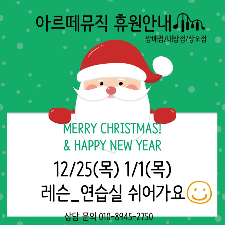 아르떼뮤직 방배점/내방점/상도점 휴원안내 방배동 피아노학원 아르떼뮤직 연휴 휴원 안내 드려요 (방배점.내방점.상도점 전 지점 휴원) "12월25일(목) 크리스마스 1월1일(목) 신정" 연습실 _ 레슨 모두 쉬어갑니다 ! 문의사항은 아래 번호로 연락 주세요 ❤ 행복한 연말 보내세요 !! 아르떼뮤직 음악학원 방배점/내방점/상도점 ⏰성인 평일 저녁/주말 수업 가능 ✔️1:1 맞춤형 개인 레슨 ✔️20대부터 60대 이상까지 모든 성인 ☎️문의 010-8950-2750 <img src="https://blogthumb.pstatic.net/MjAyNTEyMjJfMTY0/MDAxNzY2MzkwNTQ3NjQ1.Hfh_5e7nqsgfm9FKFTmVKcl4sK6IvfHewP07w6WgZaog.pIk_rmkdBXQ0K5DKEXYK1FNeOzfpMfPZlAJfKO79A-Mg.JPEG/%C8%DE%BF%F8_%BA%ED%B7%CE%B1%D7.jpg?type=s3" />