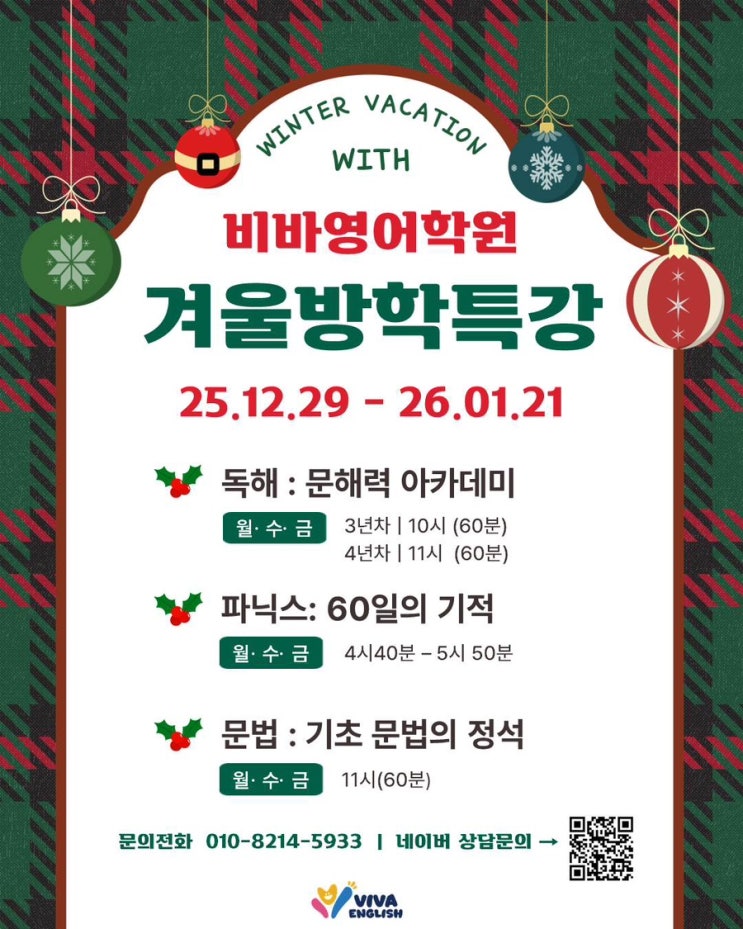 안녕하세요. 공릉2동 태릉초 태랑초 영어학원 비바에서 겨울방학 특강안내 드립니다. 1. 독해 3회독 학습법으르통한 문해력 챙기기 읽기전 배경지식 쌓기 활동을 통한 글의 이해를 높이고 가리키는 말의 의미 파악하기 활동으로 글의 흐름을 압니다. 문단별 중심내용과 텍스트 도식화를 통해 글의 구조를 분석, 요약하기로 마무리 합니다. *교육비 | 198,000원(교재포함) 월수금 10시 (AR1-2), 11시 (AR2-3) 2. 문법 반이동하여 문법을 처음해본 학생들, 문법의 기초가 약한 학생들을 대상으로 오픈됩니다. be동사/일반동사의 기초부터 시제까지 다뤄집니다. *교육비 | 198,000원(교재포함) 3. 파닉스 정확한 음가인지 및 CVC조합이 어려운 학생....... <img src="https://blogthumb.pstatic.net/MjAyNTEyMThfMjI1/MDAxNzY2MDI5NzAzMDI3.PTez5_-9rhYpYaBm_BoC4O_epcck8Ee6_vyHnH6JH4Mg.pkbcuFgfGdmUylX3lccG5AGirZXrizcu12MbUEYgxiAg.JPEG/IMG%A3%DF4864.JPG?type=s3" />