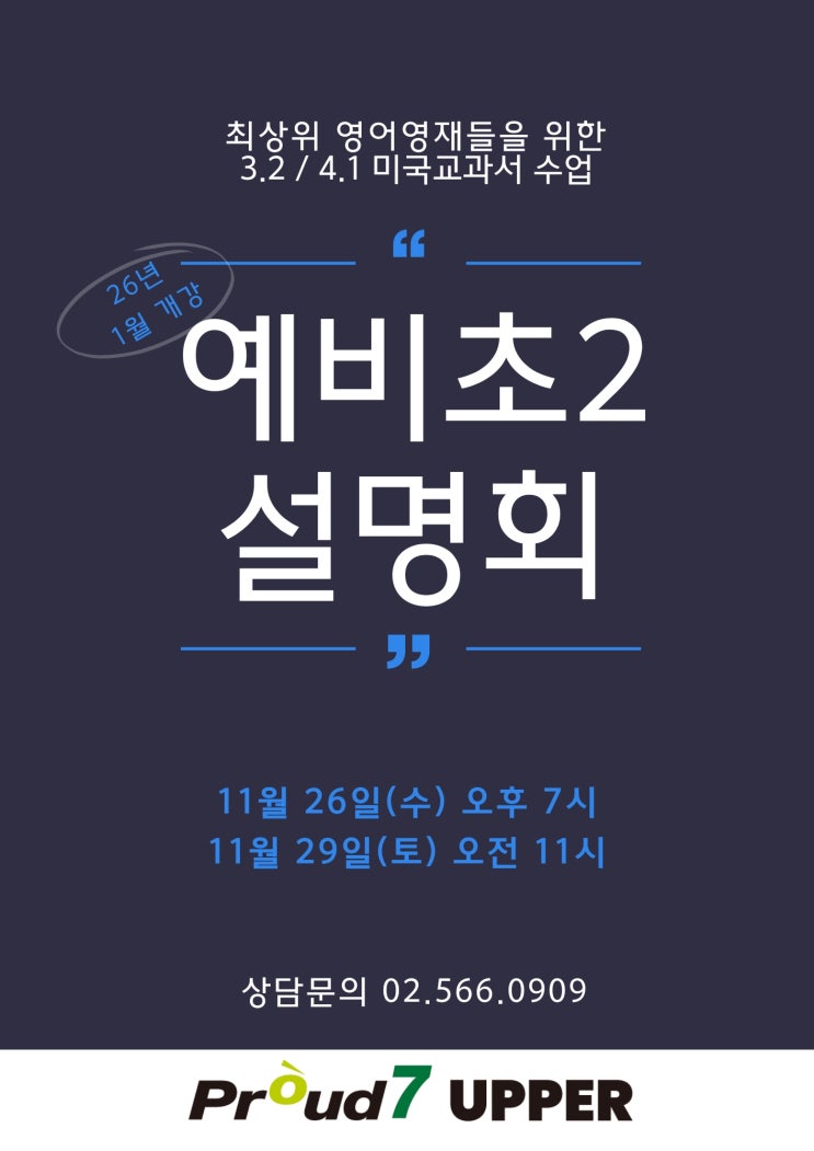 안녕하세요. 대치동 최상위 학생들을 위한 PROUD7 UPPER 입니다. 2026년 예비초2 설명회 일정 안내드립니다. 설명회 참석을 원하시는 분들은 아래의 링크를 통해 홈페이지 회원 가입 후 신청 가능합니다. 설명회 및 선발고사 예약 <img src="https://blogthumb.pstatic.net/MjAyNTExMThfMjUw/MDAxNzYzNDQxNjE4NzM2.eiIoyNAdchoD1lQ34efMQPtKTcGxSDWKAvls9FngjUog.c-20SQvZ_FdphmhaXPEgofM7LP8Nr-Vbhj3tDnsF-SAg.JPEG/%BF%B9%BA%F1%C3%CA2_%BC%B3%B8%ED%C8%B8.jpg?type=s3" />