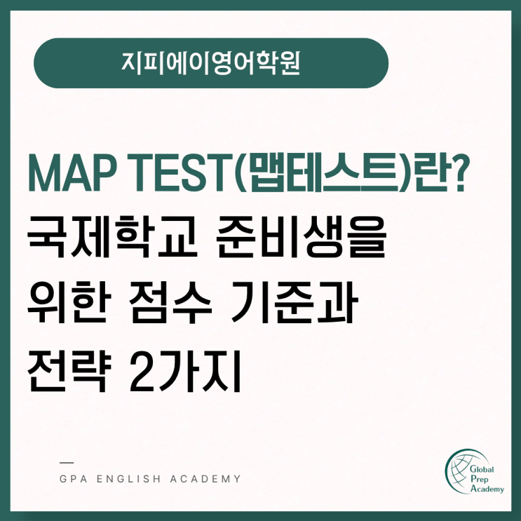 MAP TEST란? 국제 학교 준비생을 위한 점수 기준과 전략 반갑습니다. 학생별 맞춤 전략을 제공하는 지피에이영어학원 원장 정승주입니다. 연말이 다가와서 그런지 자녀의 입학에 대해 고민하시는 분들이 많이 계신 거 같아요. 특히나 학원에서 상담을 하다 보면 국제 학교를 목표로 하시는 분들은 이런 고민을 말씀하십니다. “MAP TEST가 정확히 뭔가요?” “어떻게 준비하는 건지 모르겠어요.” 그래서 오늘은 국제 학교 입학에 꼭 필요한 요소 중 하나인 맵 테스트에 대해 하나씩 말씀드려보려고 해요. 평소 위와 같은 고민을 가지고 계신 학부모님들과 학생들에게 이 글이 조금이나마 도움이 되었으면 좋겠습니다. ^^ 목차 정의 및 점수 구조....... <img src="https://blogthumb.pstatic.net/MjAyNTEyMDRfMjYg/MDAxNzY0ODQ5NTIwNjI5.X2FMEOZNoaPzpXA3dH3kPrPz5FDiCcqMcIWqIYTBeswg.zWE-1HK9YJzlPlYcrbSP53oPhlT-anK5I5HpMzmRiuwg.PNG/1.png?type=s3" />