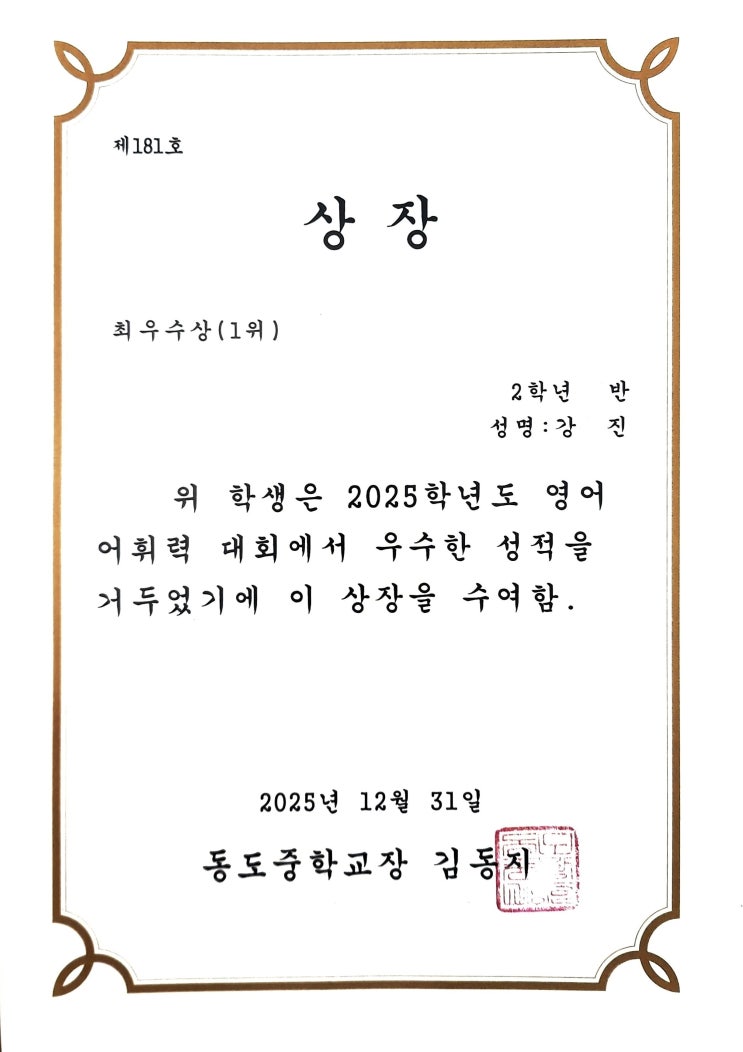 뉴탑영어전문학원 l 신수동영어학원 중등부축하합니다 동도중 강*진 교내 영어 어휘력 대회 최우수상(1위) 수상