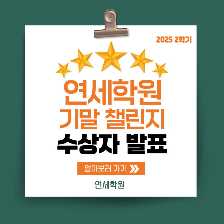 기말고사 챌린지로 한 단계 더 성장한 아이들 안녕하세요. 연세학원입니다 지난달, 우리 학원에서는 기말고사 첼린지 이벤트를 진행했습니다. 단순히 시험 점수만으로 평가하는 방식이 아닌, 아이들의 전반적인 학습 과정과 태도까지 함께 바라보고 싶었기 때문입니다. 기말고사 챌린지, 이렇게 진행했어요 이번 첼린지는 다음 세 가지 기준을 종합해 점수화했습니다! 1. 기말고사 시험 성적 2. 수업 태도와 집중도 3. 과제 이행, 자기주도 학습 등 공부 성실도 결과적으로 ‘점수만 잘 받는 아이’가 아닌, 꾸준히 노력하고 성장한 아이들이 자연스럽게 빛날 수 있는 구조로 진행되었습니다. 1등부터 10등까지, 모두가 주인....... <img src="https://blogthumb.pstatic.net/MjAyNjAxMjJfMjM3/MDAxNzY5MDc2ODA0MDQ2.BzYxdaTKHPPeF7JxfFEwjYzPi0Xb6YXtiomyXHNVd00g.7Re1cOLnmRITTUPGt0thFtOQE1Qig9GzdovaLI4xSbkg.PNG/%BF%AC%BC%BC%C7%D0%BF%F8%BA%ED%B7%CE%B1%D7_%BC%B6%B3%D7%C0%CF.png?type=s3" />