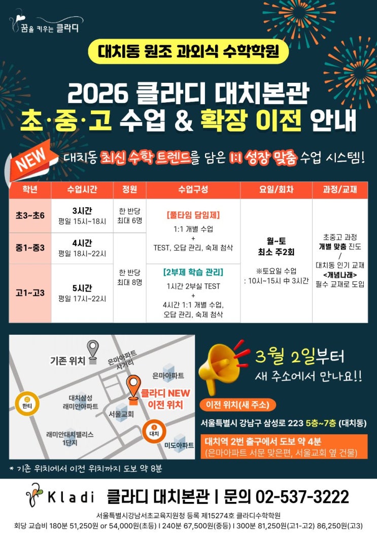 대치동 수학학원 클라디, 확장 이전 완료! 학습 습관 만드는 초등부 풀타임 담임제 안내