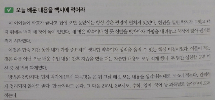 백지 정리 법 -유니콘 학생들에게 꼭 알려주고 싶은 학습법 오늘 배운 내용을 백지에 적어라! 백지 공부법은 매우 쉽고, 간단하지만 효과는 엄청나다. 단순히 보고 끝내는 것과는 차원이 다르다. 처음에는 놀란다. 아무것도 적지 못할 수 있으니까. 방법은 간단하다. 학교를 다녀오면 1교시부터 순서대로 백지를 펴고, 배운 내용을 적어본다. 한 글자만 적어도 좋다. 하지만 처음엔 다들 놀란다. 아무것도 적지 못하니까. 하지만 괜찮다. 공부한 내용을 돌이켜 보는 것만으로도 훌륭하니까. 하지만. 점차 쓰는 양이 늘어난다. 어떻게 이게 가능한 걸까. 백지에 다시 정리를 해야 한다는 생각이 수업에 집중도를 높인다. 수업을 들으면서 '이....... <img src="https://blogthumb.pstatic.net/MjAyNjAyMDNfMTEy/MDAxNzcwMTA3MDE0NjA2.F9gJ4PXO4sxBYVwzdBPzPcg-9y1XJpue7lYmOTFKPgQg.1rlqbd0yS6zUbtmSDDxeOD7zllh1BoPVzjZekKH-Ztkg.PNG/image.png?type=s3" />