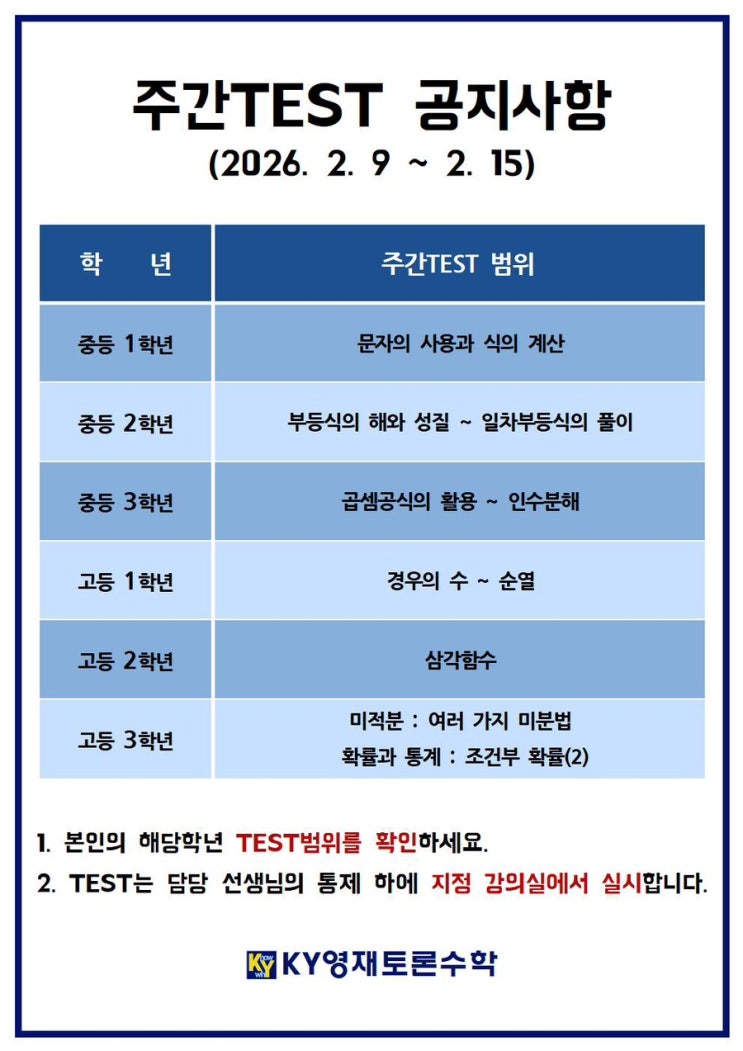 2026년 2월 2주차 주간테스트 공지사항