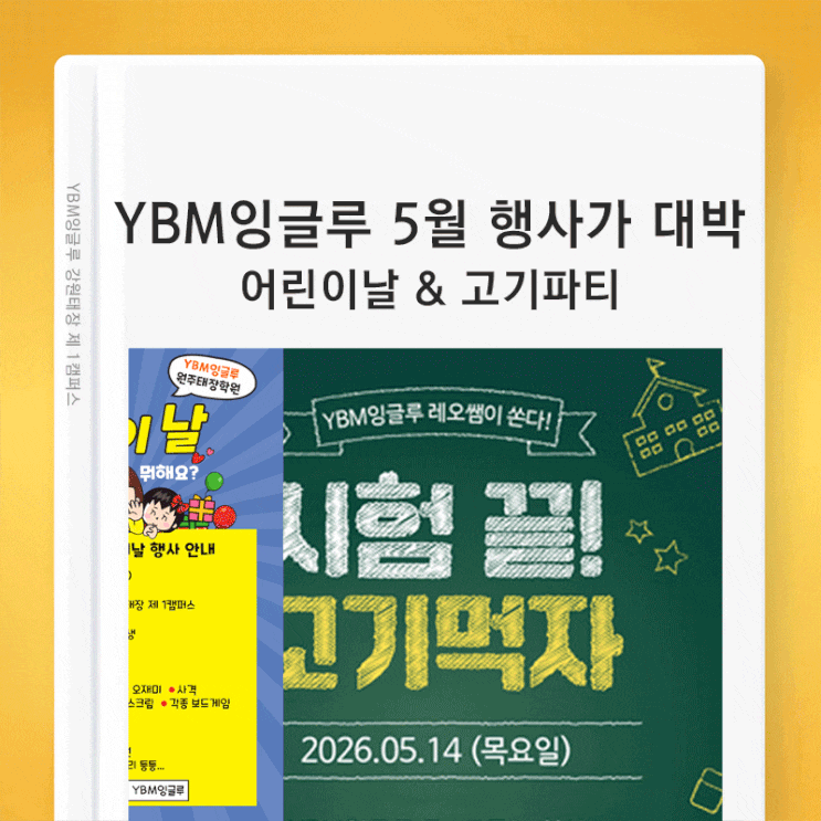 원주 영수 학원 YBM잉글루 5월 행사 큰걸로 2개 갑니다 ㅋㅋ 5월에 어린이 날!! 그리고 매년 7월에 했던 중.고등부 고기파티를 이번에는 더위를 피해서 5월 14일에 하기로 결정했어요ㅎㅎ 중간고사 끝나고 고기먹자!! 원주 태장동 명륜진사갈비로 ㄱㄱ 초등학생이 좋아하는 어린이날과 중학생. 고등학생 친구끼리 명륜진사갈비에서 회식 5월이 기다려지겠죠?ㅋㅋ 초등학생이라면 가장 기다리던 날 우리학원 5월의 행사 어린이날은 게임하며 놀고, 돌림판&뽑기 하면서 상품받고 떡볶이 아이스크림 과자 등 먹으면서 학원에서 친구들과 노는시간! 매일 같이 공부하던 친구들과 함께 노니까 더 재밌어요 ㅎㅎ 중.고등부 행사는 고기파티가 최고....... <img src="https://blogthumb.pstatic.net/MjAyNjAzMzFfMjI1/MDAxNzc0OTU5MzQ2NzQ0.FbiLorymZD84DoNTScgSZTiU0oKKaY5snZonwt07Zc8g.zrA_IBl31LBtgCJ0trcyIepV0cNkJrTEHyJ8veJhJqIg.GIF/%BD%E6%B3%D7%C0%CF.gif?type=s3" />