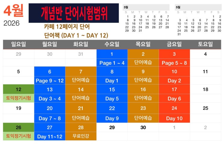 【원주토익전문】 좋은 강의 교재 집필과 문제 만드느라 많이 바빠서 1시 문제풀이반 6시 40분으로 옮겼어요~ 화목입니다!!! 【4월 시간표&단어시험범위】 시간표와 단어시험범위 시행 착오 없도록 주의하세요~~ 무엇보다도 종강 날짜 잘 살펴 보세요!!! 【5월 시간표&단어시험범위】 【단기고득점 전략】 정말 단순하지만 막강한 학습 전략 3가지 명심하세요!!! 첫째, 아이이토익학원이 안내하는 단어 열심히 공부한다 실용 영어에 잘 맞는 단어 학습이 중요해요~ 많이 외우는 것도 중요하지만, 핵심단어 그리고 단기고득점 전략에 적합한 단어 학습 필요합니다~~~ 두번째, 예습과 복습입니다!!! 수강 전 워밍업 차원에서 기본 개념 10분....... <img src="https://blogthumb.pstatic.net/MjAyNjAzMzFfMjM4/MDAxNzc0OTY1NDQxMjY4.uk2iwzUmLdCYGuoydPS1xcpgxEuuNdALSzgBfcjNQpwg.sGkD3wZoOCCbBmaCa1fQMnQGp55RGS5B2pZx2F_Qgrkg.JPEG/4%BF%F9_%B0%B3%B3%E4%B4%DC%BE%EE.jpg?type=s3" />