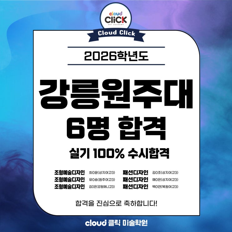 2026 강릉원주대 합격을 진심으로 축하합니다! ★2026년 수시/정시 합격★ 높은 경쟁률 실기전형 압도적 합격!! 2026 서울과기대 13.00:1 합격 2026 숙명여대 2명 합격 2026 경희대 11.50:1 합격 2026 중앙대 2명합격 2026 동덕여대 25.17:1 합격 2026 동덕여대 16.87:1 합격 2026 동덕여대 9.45:1 합격 2026 상명대 36.40:1 합격 2026 상명대 6.90:1 합격 2026 덕성여대 24.44:1 합격 2026 서경대 16.80:1 합격 2026 단국대 12.35:1 합격 2026 단국대 16.67:1 합격 2026 명지대 20.00:1 합격 2026 가천대 23.37:1 합격 2026 강원대(본교) 12.06:1 2명합격 2026 평택대 13.55:1 합격 2026 백석대 16.93:1 합격 2026 청주대 9명 합격 2026 동국대....... <img src="https://blogthumb.pstatic.net/MjAyNjAzMDlfMjE5/MDAxNzczMDU5NjE0NTQ1.FNdCkCgNkaVKdBo4wqssoRza68goy3YltAuNIqgxay8g.FRSz20HBIYv4ufRXgO2K1CsnLTZ2016lN5CEGw4ZHmAg.JPEG/2026-%C5%AC%B8%AF-%C3%D6%C1%BE%28%BA%ED%B7%CE%B1%D7%BF%EB%2920.jpg?type=s3" />