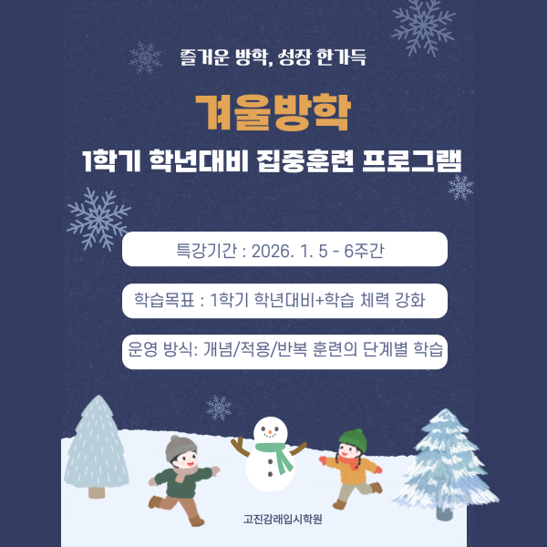 겨울방학은 1학기 성적의 방향을 결정짓는 가장 중요한 시기입니다. 개학 후 따라가는 공부가 아니라, 미리 준비하고 여유를 만드는 학년대비가 필요합니다. 청주입시학원 고진감래입시학원에서는 1/5부터 총 6주간, 1학기 핵심 내용을 학년대비하고 학습 시간을 대폭 늘려 집중 훈련하는 겨울 프로그램을 운영합니다. 프로그램 핵심 포인트 운영 기간: 1월 5일 시작 / 총 6주 과정 학습 목표: 1학기 주요 개념 선행 + 학습 체력 강화 운영 방식: 개념 → 적용 → 반복 훈련의 단계별 학습 왜 ‘겨울 집중훈련’이 중요한가요? 1학기는 새로운 개념이 빠르게 진행되는 시기 개학 후에는 학교 일정과 수행평가로 학습 시간 확보가 어려....... <img src="https://blogthumb.pstatic.net/MjAyNTEyMzBfMTQw/MDAxNzY3MDYxNTU2Nzk0.b1E6-zbIL6X2NmfgHVBBYQ4rmZtdILTwMLgrApjAgqUg.QL65L1PJRP7bsMEw5GY9u2OwLg1xbvhUGPmhq6YanTsg.PNG/%BC%D2%BF%B5-%BE%F0%B7%D0-006_%281%29.png?type=s3" />