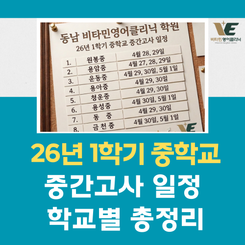 청주 동남지구 2026년 1학기 중간고사 일정 총정리 새 학기 시작되면 청주 동남지구 학부모님들의 가장 큰 관심사는 단연 중간고사 일정입니다. 학교마다 시험 기간이 다르기 때문에 미리 확인하고 학습 계획을 세우는 것이 중요합니다. 동남비타민영어학원에서 청주 지역 중학교 9개교, 고등학교 9개교의 2026년 1학기 중간고사 일정을 정리했습니다. ※ 일신여자중학교는 일정 미정으로 추후 업데이트 예정입니다. 동남 비타민영어클리닉 학원에 해당되는 학교만 다시 추려봤습니다. <img src="https://blogthumb.pstatic.net/MjAyNjAzMDZfMjcy/MDAxNzcyODA3MzI4MzEy.20xtUfLDstEl8dTQn4feAgjqkbM7vzbQkYJWZXN81nEg.kOsxvJJ0Eq3Q4jUsv3E8zzSKPxeorbMhvv82E41V8gAg.PNG/%BD%E6%B3%D7%C0%CF.png?type=s3" />