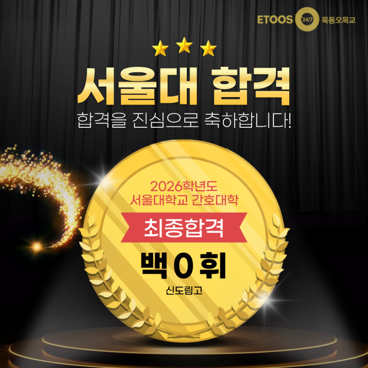 합격을 축하합니다. 2026학년도 서울대합격 백O휘 목동독학재수학원 양천구독재