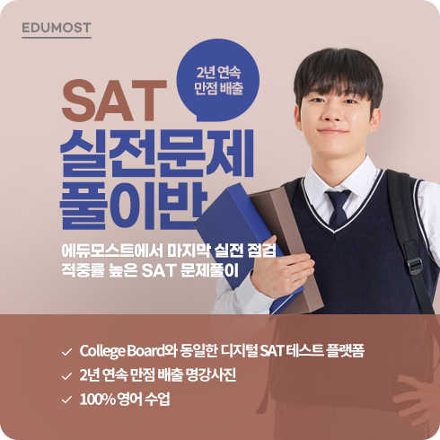 안녕하세요. 만점배출 SAT학원 에듀모스트입니다. 오늘은 3월 14일(토) SAT 시험 대비 문제풀이반 수업을 안내해 드리겠습니다. 3월 Digital SAT 대비 실전문제풀이반 (ZOOM) 단기간 점수 향상을 목표로 하는 Digital SAT 실전 대비반 2023년부터 2025년 12월까지 최신 Digital SAT 기출문제 완벽 분석 기출 분석 결과를 반영한 온라인 테스트 사이트 제공 1. 일정 및 수업 시간 (총 8회) ⭐한국 오전 8:00 – 11:00 - 2월 1일(일), 8일(일), 15일(일), 16일(월), 22일(일) - 3월 1일(일), 2일(월), 8일(일) ⭐미국 서부: 오후 3:00 – 6:00 / 동부: 오후 6:00 – 9:00 - 1월 31일(토) - 2월 7일(토), 14일(토), 15일(일), 21일(토), 28일(토) - ....... <img src="https://blogthumb.pstatic.net/MjAyNjAxMTZfOTIg/MDAxNzY4NTMzMjU2MzA5.Mn1tI_fccPwQUhxzjaqujGDkSWU64ruIHgazmlgP1nog.3LMs0OUSjRqENSsbaPYfm8pKqzzTNnY-Goe19Denf_Ug.PNG/popup_07.png?type=s3" />