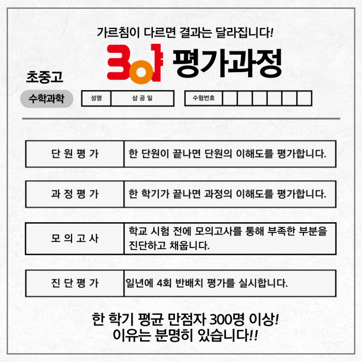 안녕하세요. 천안아산 수학과학학원인 301영재수학과학학원입니다. 301학원은 방학 동안 아이들이 편해진 틈을(?) 타서 심화로 복습을 하면서 기본을 잘 쌓고 있습니다.^^ 방학이니 예습도 물론 미리미리, 많이 시키고도 있지요. 학년별로 수준별로 부족한 부분은 방학이니 더욱더 꼼꼼하게 다지고, 학기 중에 못한 예습도 미리미리 해서 중간. 기말을 대비하거나 상위 학년 대비를 합니다. 아이들이 제일 싫어하는 시험은^^ 아이를 진단하기 좋은 시스템입니다. 한 단원이 끝나고 아이가 이 단원을 잘 이해했는지 한 학기가 끝나면 앞에 단원 까먹지 않고 개념 또는 심화를 잘 흡수했는지 선생님은 잘한다고 하지만 정말 잘 하고 있는지 학교 중....... <img src="https://blogthumb.pstatic.net/MjAyNjAxMjNfMTI2/MDAxNzY5MTcxMDMzMDc0.DM8RlF3eCBuYK2zgq6W9wG4eHD9qtODD-mMAwv6w-hgg.6mjVnELKmRPpy1qJgF6QrCZgl4Q449QouioYMmCumFEg.PNG/test.png?type=s3" />