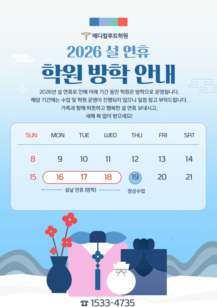 안녕하세요 메디컬루트학원입니다! 대명절 설날을 맞이하여 학원방학 일정을 안내 드릴려고 합니다. 방학 기간 동안 학원 운영 및 상담은 잠시 중단되오니, 이 점 양해 부탁드리며 일정 참고 부탁드립니다! ✔설날 학원 방학 기간 2026년 2월 16일(월) ~ 2월 18일(수) 연휴 이후에는 학생들의 학습 흐름이 끊기지 않도록 체계적인 진도 관리와 학습 점검으로 수업을 이어갈 예정입니다. 가족들과 함께 행복하고 건강한 설 연휴 보내시고 새해 복 많이 받으세요! 감사합니다♀️ 메디컬루트 학원 드림 주소 : 충남 천안시 서북구 불당동 검은들3길 48, 현대프라자 6층 전화번호 : 1533-4735 오후 2시 ~ 오후 7시반까지 전화....... <img src="https://blogthumb.pstatic.net/MjAyNjAxMjdfMjYy/MDAxNzY5NDkxNjQ2MzE3.6Zyvz3RLyLij7VOqh70KVcNkZbBQQAfmaE1mqyJgf10g.q1ukEyv_4IFbVHHiQ2AjM2_UWoRiq2duLM3F6bMFox8g.JPEG/%C1%A6%B8%F1%C0%BB_%C0%D4%B7%C2%C7%D8%C1%D6%BC%BC%BF%E4._%281%29.jpg?type=s3" />