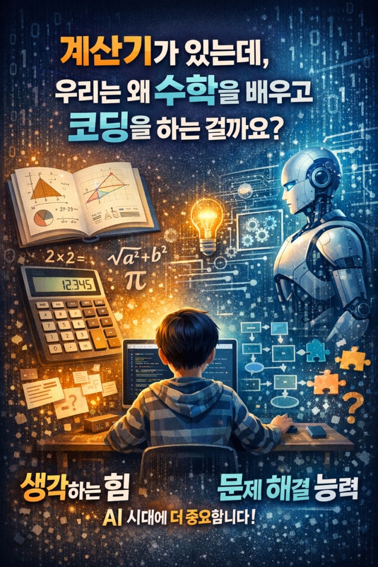 계산기가 있는데, 우리는 왜 아직도 수학을 배울까요? “AI가 이렇게 빨리 발전하는데 지금 코딩을 배워봐야 나중엔 다 AI가 해주는 거 아닌가요?” 코딩 교육을 하는 입장에서 솔직히 이 질문, 이해됩니다. 그리고… 어느 정도는 맞는 말이기도 해요. 실제로 AI는 사람보다 빠르게 코드를 짜고 오류도 잡아주고 심지어 “이런 기능 만들어줘”라고 말만 하면 그럴듯한 결과를 내놓기도 하죠. 그런데 여기서 한 가지 질문을 던져보고 싶어요. 계산기가 있는데, 우리는 왜 아직도 수학을 배울까요? 덧셈, 뺄셈, 곱셈, 나눗셈 계산기는 인간보다 훨씬 정확하고 빠릅니다. 그럼에도 불구하고 우리는 아이들에게 여전히 수학을 가르칩니다. 왜일까요....... <img src="https://blogthumb.pstatic.net/MjAyNjAxMjhfMTc4/MDAxNzY5NjA5Nzk4MDIx.vx-275AVcZDCNlC9XuARGuteJn_uSWTcp09PIgoNB84g.uSrb4Um0lvSNPZGRbf-sI66RwOjVImolA5mGJyFir_cg.JPEG/2C9D5EC4%A3%AD20E0%A3%AD4D29%A3%AD9321%A3%AD4201DC7A089F.jpg?type=s3" />