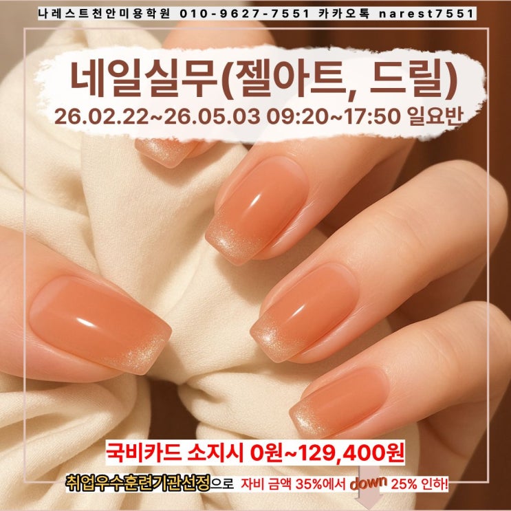 안녕하세요 나레스트천안미용학원 입니다. 네일아트, 취미 말고 진짜 실무로 배우고 싶다면? 현장에서 바로 써먹을 수 있는 젤아트 ,드릴 중심 네일실무 과정을 소개합니다 네일실무(젤아트, 드릴) 26.02.22~26.05.03 09:20~17:50 일요일(주1회) 과정 특징 ✔ 살롱에서 바로 활용 가능한 실무 위주 교육 ✔ 젤아트 표현력 강화 ✔ 드릴 사용법 집중 트레이닝 ✔ 반복 실습으로 숙련도 UP ✔ 소수정예 수업으로 꼼꼼한 피드백 네일 실무 교육 내용 젤네일 기초 및 응용 아트 네일 드릴 사용법 및 실습 네일샵 실무 중심 트레이닝 반복 실습을 통한 시술 숙련도 향상 취업 대비 실무 기술 교육 네일 실무 교육, 젤아트 수업, 드릴 실습 과....... <img src="https://blogthumb.pstatic.net/MjAyNjAyMDNfMjMw/MDAxNzcwMTExNDM0NjQ0.PNV25M07NSm4I2eyIueAcz8cVE0De8o5f2ROeYPU7tgg.bddf7TG_jWinQvO5U2fkrNln3MRyUZ9RTWOjgYyBY7Ig.JPEG/%C1%A6%B8%F1%C0%BB_%C0%D4%B7%C2%C7%D8%C1%D6%BC%BC%BF%E4._%2848%29.jpg?type=s3" />