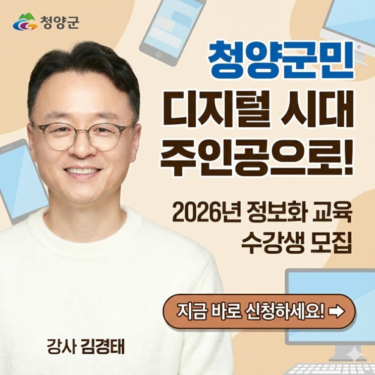 안녕하세요! 청양군민의 디지털 길잡이, 정보화 교육 전문강사 김경태입니다. 어느덧 새로운 한 해가 시작되었습니다. 해가 갈수록 세상은 빠르게 변하고, 이제 스마트폰과 컴퓨터는 우리 삶에서 뗄 수 없는 필수 도구가 되었습니다. 하지만 급변하는 디지털 세상 앞에서 막막함을 느끼시는 분들도 많으실 겁니다. 그래서 준비했습니다! 2026년 청양군 주민 정보화 교육이 드디어 활기찬 시작을 알립니다. 이번 교육은 제가 직접 여러분 곁에서 하나하나 차근차근 알려드리는 소중한 시간이 될 것입니다. 2026년 청양군 정보화 교육 안내 1) 모집 안내 신청 기간: 2026. 1. 12.(월) ~ 1. 16.(금) / 총 5일간 교육 대상: 청양군민 누구나 모집 인....... <img src="https://blogthumb.pstatic.net/MjAyNjAxMDhfMTI2/MDAxNzY3ODcxNDgwNjAx.tb1jQmc6q37YqT1BnNnPiotGO51VEzzJ7jKP5k0K7yYg.GjmPq6ZGC5hr9piuPrphP8G4XH5MnYepgXVkHG64VsIg.PNG/900%A3%DF1767871471737.png?type=s3" />
