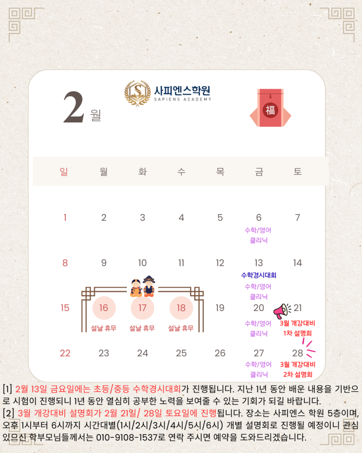 안녕하세요. 동작구 신대방삼거리역 사피엔스 영어학원, 수학학원입니다. 2월 일정표를 안내드립니다. 이번 달에도 수학경시대회가 열릴 예정입니다^^ 시험범위는 2025년 배운 내용을 다 포괄하여 보는 시험이니, 3월 새 학년에 올라가기 전 배운 내용을 꼼꼼하게 확인할 수 있는 시간이 되었으면 합니다. 구정 후, 2월 21일 / 28일 토요일은 우리 학원 설명회가 예정되어 있습니다. 사피엔스 학원의 교육목표, 강사진, 커리큘럼, 학습자료 등등 외부에 공개하지 않은 것들을 설명회 시간에 공개하고자 합니다. 이번에는 개별 설명회로 진행되어 아이와 함께 방문하셔도 좋습니다. 1시, 2시, 3시, 4시, 5시, 6시 각각 설명회를 진행할 예정이니 관....... <img src="https://blogthumb.pstatic.net/MjAyNjAyMDVfMTc1/MDAxNzcwMjMxNDc5MzY2.fEXSna-cjLj2OFTy4b5oAMkmq33uM4vwsEmJXPQI3Icg.2YdillwtXCye8kc3ovMW5jZOQ1pFT6twQPu4vEFOFUEg.PNG/%BA%A3%C0%CC%C1%F6%BB%F6_%B1%F2%B2%FB%C7%D1_2026%B3%E2_2%BF%F9_%C8%DE%B9%AB_%B4%DE%B7%C2_%C0%CE%BD%BA%C5%B8%B1%D7%B7%A5_%B0%D4%BD%C3%B9%B0.png?type=s3" />