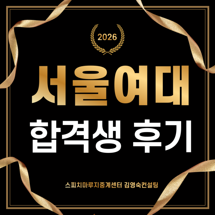 안녕하세요? 스피치마루지중계센터 김영숙컨설팅입니다! 오늘은 2026학년도 서울여대 합격 소식을 전해드리려 해요! 우리 원에서 서울여대 합격생이 나왔습니다!! 정말 기쁜 소식이죠! 합격 소식을 전해 들으니 그동안 준비하던 모습들이 하나하나 떠오르더라고요. 정말 수고 많았어요!! 우리 친구들은 자신의 경험을 정리하고 왜 이 학교에 지원했는지, 그리고 어떤 학생으로 대학생활을 하고 싶은지 차근차근 이야기로 정리하면서 면접을 준비했답니다!! 답변을 외우는 면접이 아니라 내 생각을 또박또박 전달하는 연습, 긴장해도 끝까지 말할 수 있는 연습을 꾸준히 했어요! 역시!! 열심히 준비한 만큼 좋은 결과가 나왔네요 2....... <img src="https://blogthumb.pstatic.net/MjAyNjAzMTRfMjY5/MDAxNzczNDQ5MTM0NzA1.xeSyNGFJMu7GBF5sCDcVVxnW9WTWWbfv1t0dwOl8kl4g.LRpCvImt4W5vUi3MxGnKUkbCevsaOfZBZ60cIFR3BgMg.PNG/%BC%AD%BF%EF%BF%A9%B4%EB%C7%D5%B0%DD%C8%C4%B1%E2_1.png?type=s3" />
