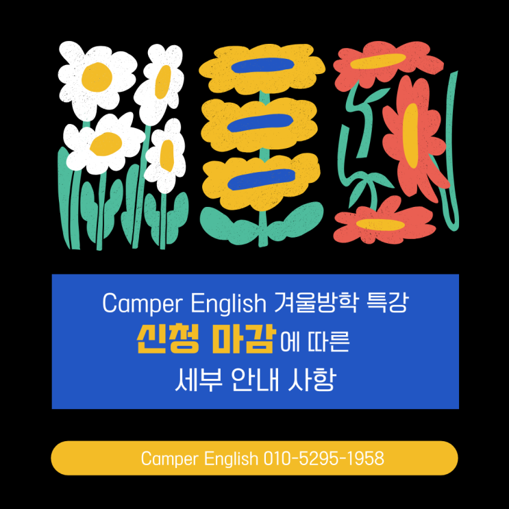 Camper English 겨울방학 특강 안내 Camper English 겨울방학 특강반이 모두 마감되었습니다. 신청해주신 학부모님들께서는 내용을 꼼꼼하게 읽어 보시기 바랍니다. Camper Englis 방학 특강은 고등 내신과 수능까지 바라보며 나아갑니다. 문법을 “외우는 것”이 아니라 문장으로 연결되는 언어의 뼈대로 가르칩니다. Camper English 문법 수업은 지금의 성적이 아니라, 고등 내신과 수능을 기준으로 설계합니다. 겨울방학 특강, 이렇게 진행됩니다 이번 겨울방학 특강은 학생의 현재 수준에 따라 반을 세분화해 운영합니다. Upper Camper 중학교 2학년 이상 또는 Camper English 특강 수강 이력이 있는 학생 수업 시간 화·수·목 11:00 ~ 13:30 ....... <img src="https://blogthumb.pstatic.net/MjAyNTEyMThfNDQg/MDAxNzY2MDUzMzE4MDc3.EqQ_Bgl4JnbUYdKWhC2Vc48DnPbNZTn2O9DM6tt6AvQg.CjNqKd0_-u_gwX3zxMtN8bXn2Es0LUiMx9v1FJx0iS0g.PNG/1_%2817%29.png?type=s3" />