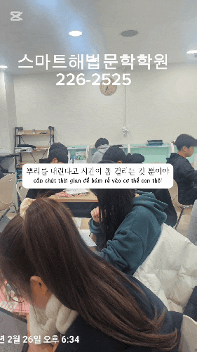 겨울방학동안 스마트해법문학학원 학생들은 수학공부 진~~짜 열심히 했습니다 어떻게? 1월 4일부터 ~~2월27일 까지 아침 9시에 수업시작 1분 지각할때 마다 지각비 1000원씩~~ 학생들 절대 안늦어요 원장님 깜놀 ~~ 수업시간은 2시간 이지만 2시간동안에 수업량을 해결하지 못하면 그날의 목표량 완수하고 갑니다 최대 1시간 보강하게 됩니다 그러니까 수업시간에 얼마나 열싱히 하는지~~~ 그럼 제대로 수업을 듣고 알고 있는지는 어떻게 확인하지? 스마트해법문학학원만의 목요TEST에서 점검합니다 80점 미만은 재시험입니다 스마트해법문학학원 학생들 최선을 다해서 문제풉니다 시험은 배운것을 최대한 기억하게하는 장치입니다 그리고 시험성....... <img src="https://blogthumb.pstatic.net/MjAyNjAzMDRfMjk2/MDAxNzcyNTg1Mjg4MjU1.2gWFdqmvrAfvjx4gkSqHCqTMnb6QD7AUivZSGgBBUXIg.9NLF1mtXmyiTRICpHBiWFuang5UHf5OSFDAIu49BI1Yg.GIF/se%A3%DFone%A3%DFani%A3%DF20260304%A3%DF094804%A3%DFa.gif?type=s3" />