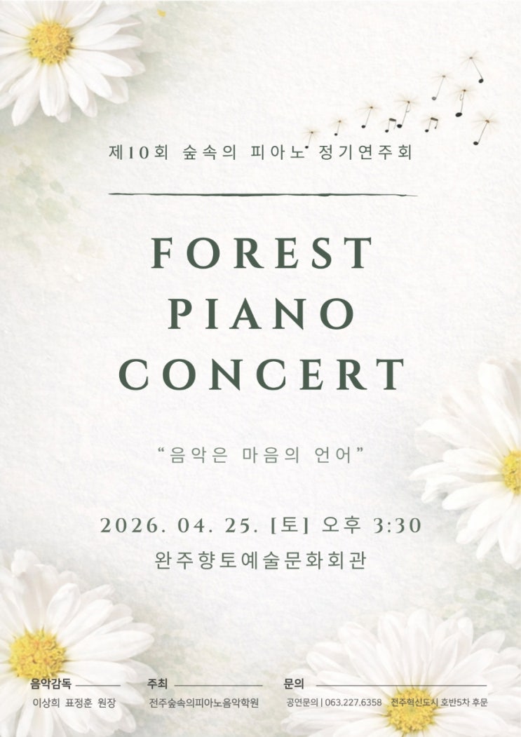 안녕하세요. 따뜻한 봄과 함께 숲속의 피아노 정기연주회 소식을 전해드립니다. 제10회 숲속의 피아노 정기연주회 2026년 4월 25일 (토요일) 완주향토예술문화회관 어느덧 열 번째를 맞이한 정기연주회입니다. 한 해, 한 해 쌓여온 시간들 속에서 아이들은 음악과 함께 조금씩 성장해 왔습니다. 이제 연주회까지 한 달도 채 남지 않았습니다. 아이들은 각자의 무대를 위해 하루하루 정성을 다해 연습하고 있습니다. 때로는 어려운 곡 앞에서 고민하고, 작은 실수에 아쉬워하기도 하지만 그 모든 과정이 모여 무대 위에서 가장 빛나는 순간으로 이어질 것입니다. 정기연주회는 단순히 연주를 보여주는 자리가 아닌, 아이들이....... <img src="https://blogthumb.pstatic.net/MjAyNjA0MDFfMTk4/MDAxNzc1MDM5MjQyODc5.rgE_3otuMc4CgoNzRWUBIDHo_5_QEV_XR5ljz7m42Gwg.FNfFXfGMtnHC9o9yalI59-GGW5LQb_7hq5CEvwtWHL8g.JPEG/900%A3%DF1775038495347.jpg?type=s3" />