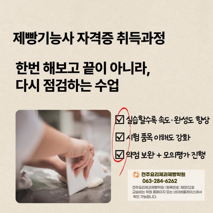 제빵기능사 실기시험에서 가장 중요한 것은 레시피 암기가 아니라 손에 익은 작업 능력입니다. 전주요리제과제빵학원의 제빵기능사 과정은 시험 품목 진도 + 복습 + 모의평가가 포함된 구조로 운영됩니다. 처음에는 기본 공정을 배우고, 다시 한 번 같은 품목을 점검하면서 속도와 완성도를 끌어올립니다. 실습할수록 “아, 이게 이렇게 되는 거구나” 라는 감각이 생기도록 지도합니다. ✔ 실습 위주 수업 ✔ 시험 품목 완전 정복 ✔ 약점 보완 + 모의평가 제빵기능사 자격증, 혼자 고민하지 말고 체계적으로 준비하세요. [제빵기능사자격취득과정 안내] - 26.02.12 ~ 26.03.26 - 월~금 / 오후 14:00~17:30 - 문의 : 063-284-6262 - 전주시 완산....... <img src="https://blogthumb.pstatic.net/MjAyNjAxMzBfMTEz/MDAxNzY5NzQxODA2NTQ3.9rijL_e6nuRP8WPGOs2m8M5b8MpsVyA1lm-so8N9QOQg.IZQmYA_o4ZpKe58ukw7DssxeXYNgGnnRnaieHWSH2sQg.JPEG/2.jpg?type=s3" />