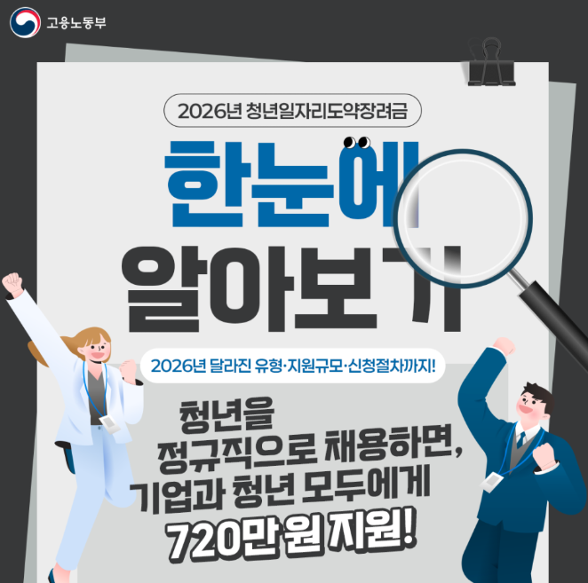 2026년 청년일자리도약장려금 달라진 내용을 확인해보세요 ✨ 비수도권 인력난 완화를 위한 지원 확대 ✨ 청년 정규직 채용 시 지원 ✨ 최대 720만 원 지원 자세한 내용은 고용24에서 통해 확인해보세요. ☎️ 문의: 국번없이 1350 직업상담사2급과정 고용24 수강신청 바로가기 ⏩ https://buly.kr/ET0AOkW 2026.04.06.~ 2026.05.22. #고용노동부 #청년일자리도약장려금 #청년지원 #기업지원 #청년고용 #비수도권지원 #고용24 <img src="https://blogthumb.pstatic.net/MjAyNjAzMjZfMTkz/MDAxNzc0NDk4MjkxMzUx.9a3q1kugQzOQ1V-OArrx3tV6uUjgr8m8MPPv5JyDwucg.ogpTMa1atZbqvGGuFBixK006it4gvg6YNzgKO2QDveIg.PNG/image.png?type=s3" />